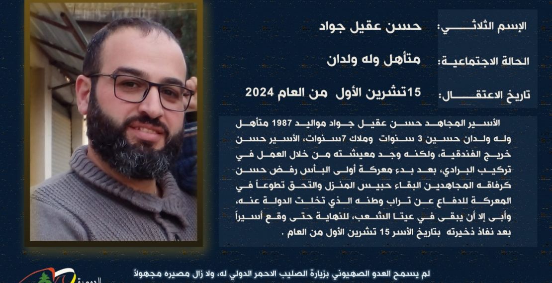 في سياق متابعة ملف الاسرى والمعتقلين والرهائن اللبنانيين لدى العدو الصهيوني، نشرت "الجمعية اللبنانية للاسرى والمحررين" بطاقة تعريف عن الاسير، (حسن عقيل جواد)، الذي أسره العدو من بلدة عيتا الشعب بعد نفاد ذخيرته خلال معركة "أولي البأس" ، ولفتت الجمعية الى تقاعس الدولة عن القيام بواجبها تجاه الاسرى، كما أشارت الى رفض العدو قيام الصليب الاحمر بلقاء الاسرى والمعتقلين اللبنانيين لديه، في خرق للاتفاقات والمعاهدات الدولية .