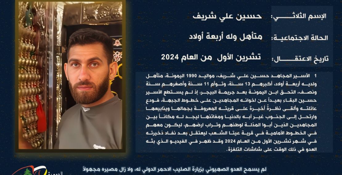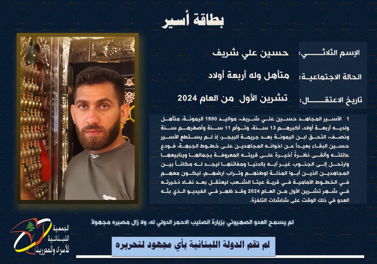 في سياق متابعة ملف الاسرى والمعتقلين والرهائن اللبنانيين لدى العدو الصهيوني، نشرت "الجمعية اللبنانية للاسرى والمحررين" بطاقة تعريف عن الاسير، حسين علي شريف، مواليد اليمونة 1990.