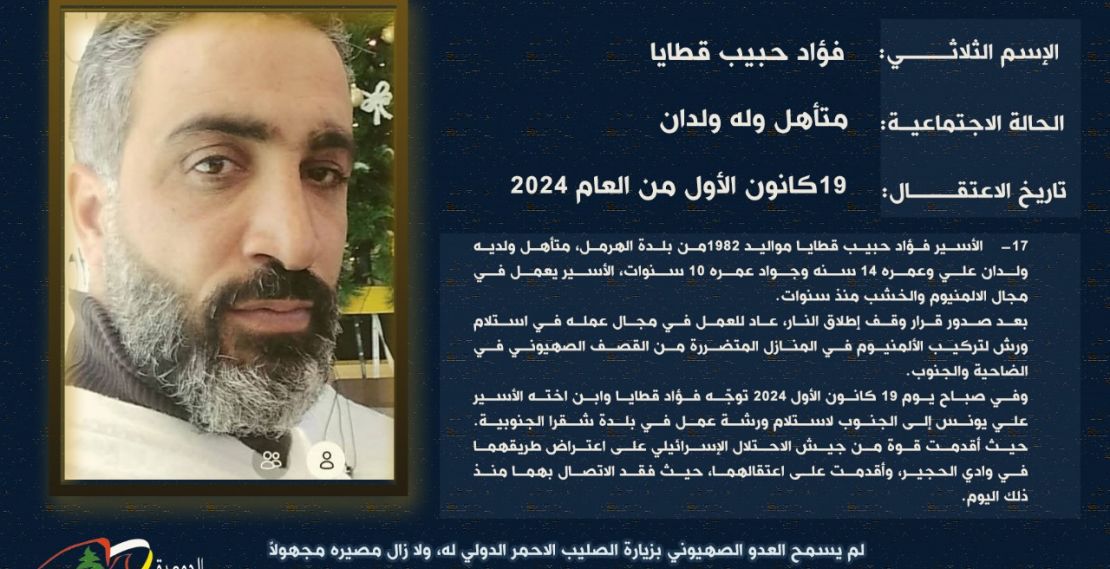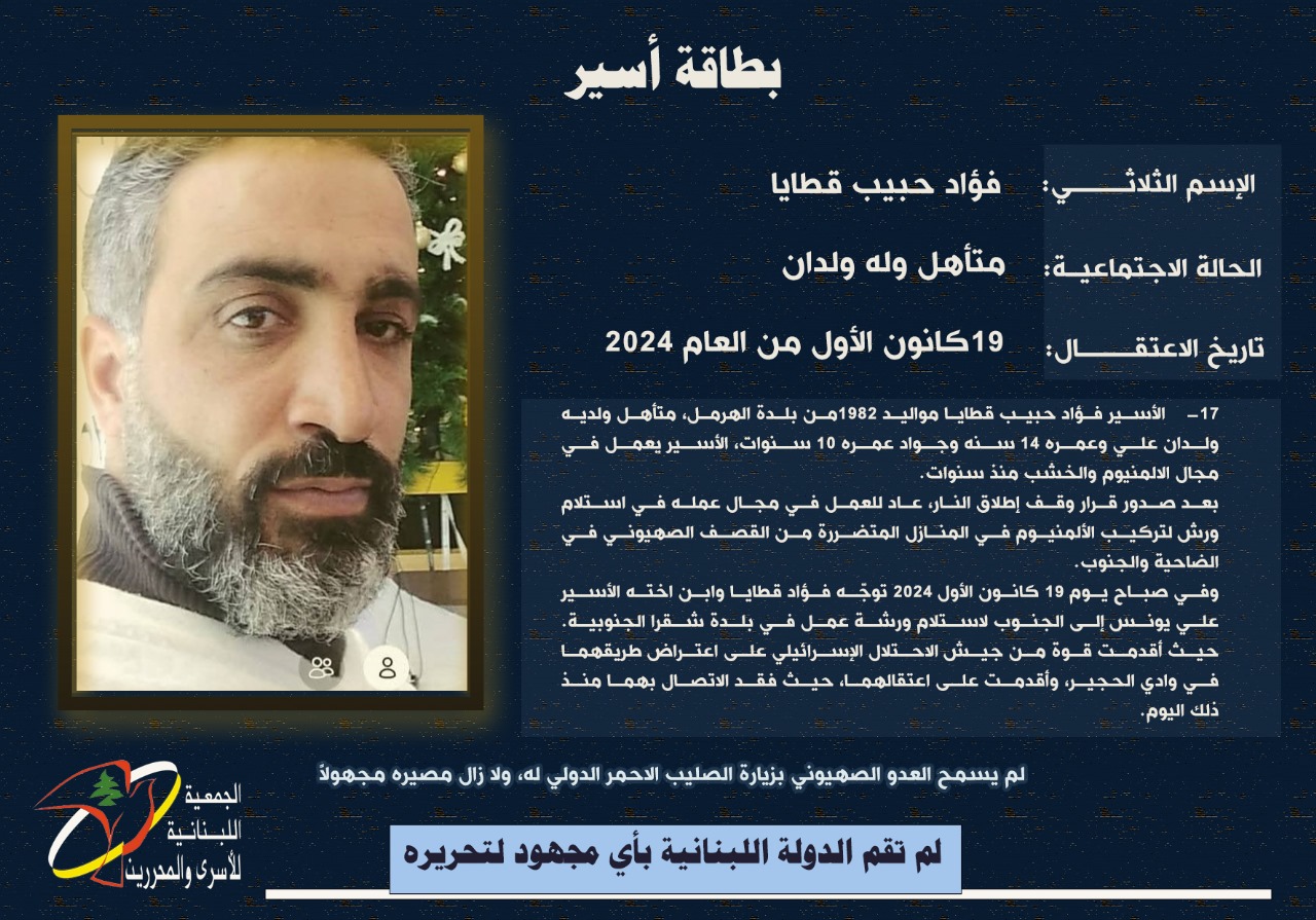 في سياق متابعة ملف الاسرى والمعتقلين والرهائن اللبنانيين لدى العدو الصهيوني، نشرت "الجمعية اللبنانية للاسرى والمحررين" بطاقة تعريف عن الاسير المدني، فؤاد حبيب قطايا مواليد الهرمل 1982.