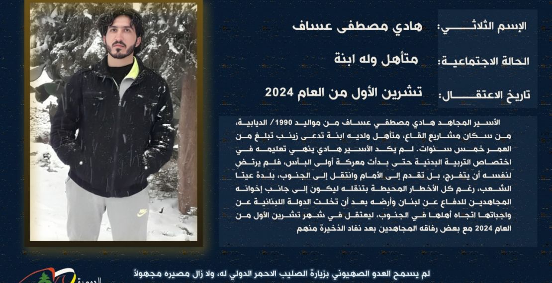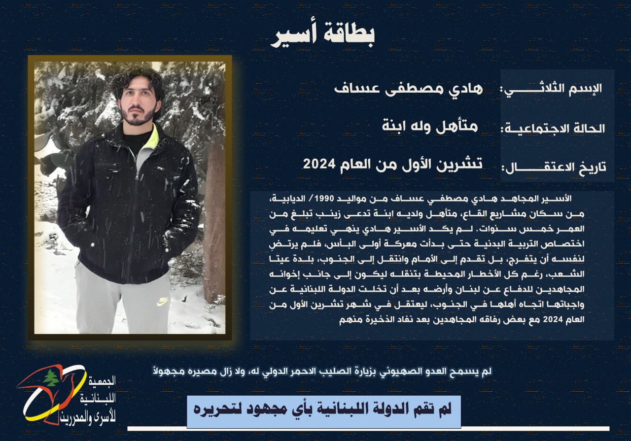 في سياق متابعة ملف الاسرى والمعتقلين والرهائن اللبنانيين لدى العدو الصهيوني، نشرت "الجمعية اللبنانية للاسرى والمحررين" بطاقة تعريف عن الاسير، هادي مصطفى عساف، مواليد الديابية،1990، من سكان مشاريع القاع.