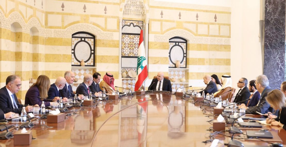 "ترأس رئيس الجمهورية العماد جوزاف عون اجتماعا قبل ظهر اليوم في قصر بعبدا، حضره مستشار وزير الخارجية السعودي يزيد بن فرحان، والموفد الفرنسي الوزير السابق جان ايف لودريان، والسفير الاميركي في لبنان ميشال عيسى، وسفراء: السعودية وليد بخاري، ومصر علاء موسى، وقطر سعود بن عبد الرحمن ال ثاني، وفرنسا هيرفيه ماغرو.